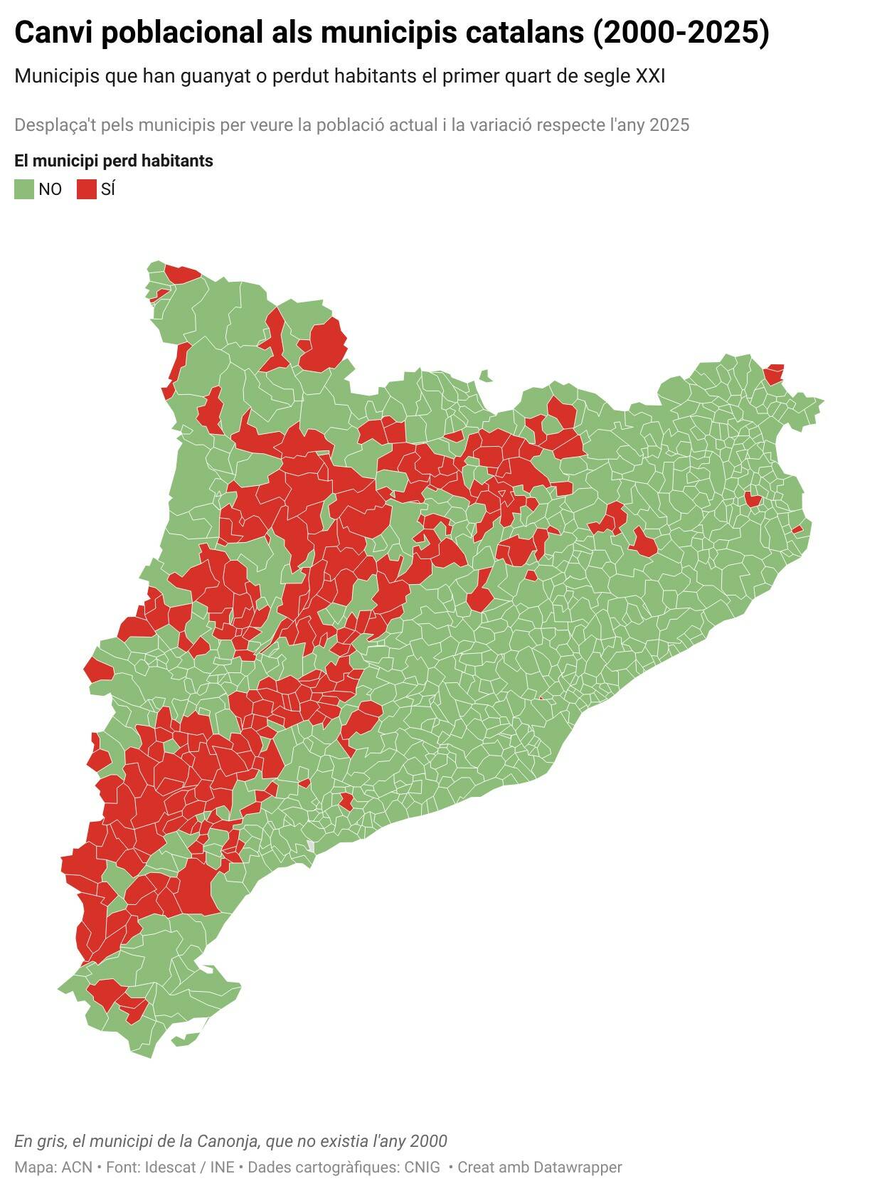 En qualsevol cas, el conjunt de Catalunya ha guanyat 1,7 milions d’habitants en un quart de segle, passant de 6,2 milions a més de 8. En el context europeu només quatre dels 27 països de la UE han viscut un ritme de creixement més gran. Dels 20 milions de ciutadans que el club comunitari ha guanyat en aquest temps, un de cada deu és resident a Catalunya. Com s’ha explicat sovint, el salt demogràfic s’ha degut principalment a l’arribada de persones d’altres països, que avui són un 25% dels catalans i que majoritàriament han poblat l’àrea metropolitana i les zones costaneres. La seva presència, però, no ha evitat l’envelliment poblacional -l’edat mitjana ha passat de 40,6 a 43,7 anys- ni tampoc el despoblament als micropobles: prop de 200 han perdut habitants.