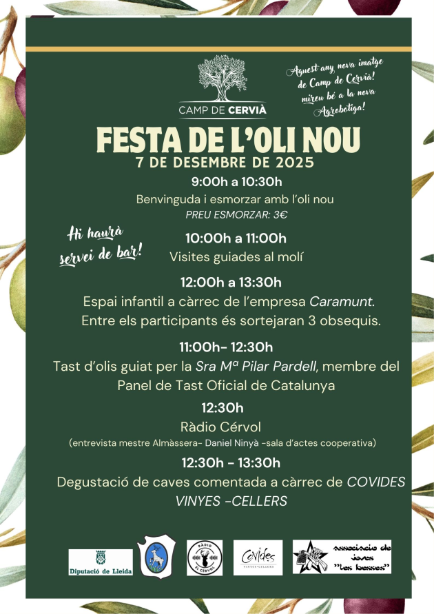 Cervià de les Garrigues celebrarà diumenge la tradicional Festa de l’Oli Nou, amb esmorzar de benvinguda (de 9.00 a 10.30 hores), visites guiades al molí (de 10.00 a 11.00) i un espai infantil (de 12.00 a 13.30). El programa inclou un tast guiat d’olis a càrrec de M. Pilar Pardell (d’11.00 a 12.30) i una degustació comentada de caves oferta per Covides Vinyes-Cellers (de 12.30 a 13.30 h).