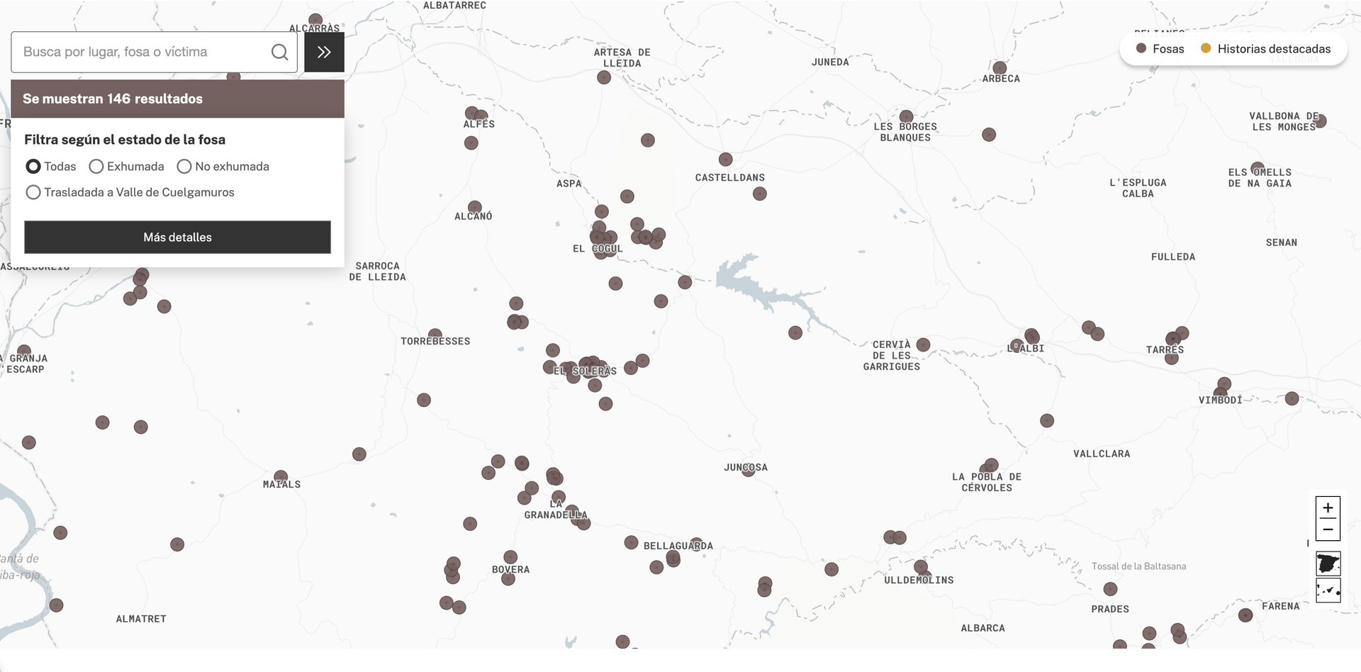 Així mateix, el projecte permet buscar entre sis categories d’històries com les fosses exhumades o aquelles que van ser traslladades al Valle de los Caídos, ara Cuelgamuros. En aquest últim apartat, es té constància del trasllat de restes des de punts com el Soleràs.
