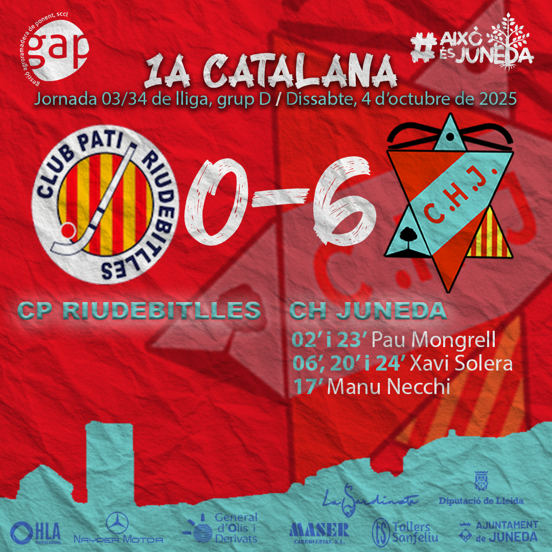 El Club d’Hoquei Juneda continua destacant pel seu rendiment ofensiu a la Primera Catalana després d’anotar sis gols en el seu tercer partit de la temporada. Amb un total de 18 dianes, l’equip es manté com el màxim golejador dels dos grups de la categoria. En aquesta ocasió, el rival va ser el Club Patí Riudebitlles, que no va aconseguir marcar cap gol durant els 50 minuts de joc.